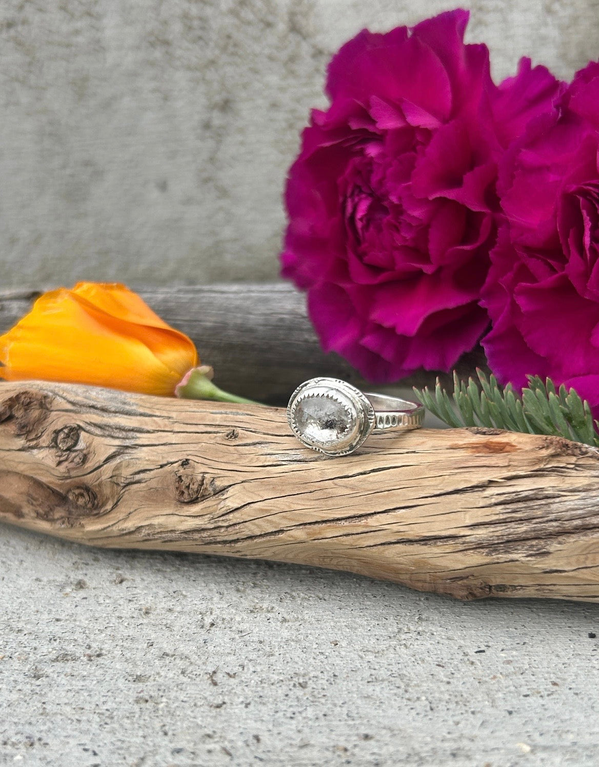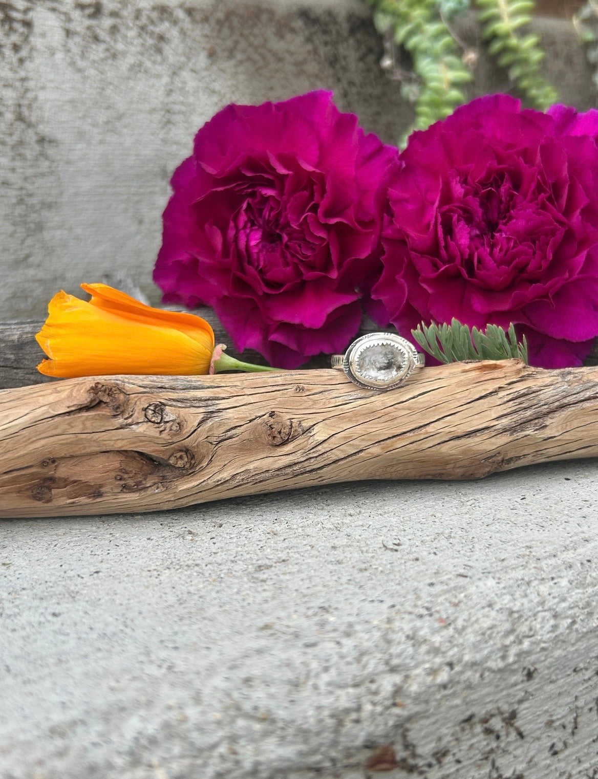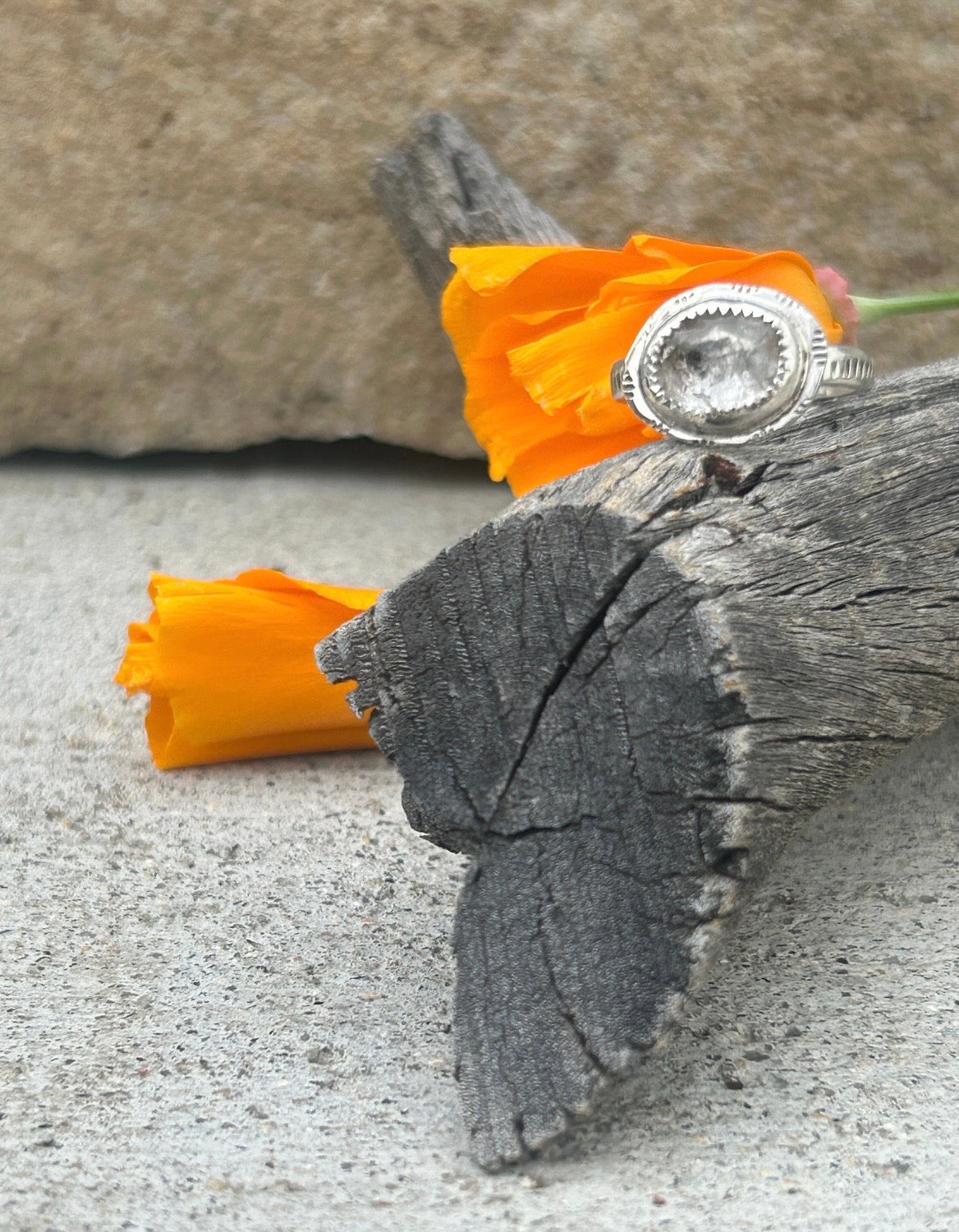 Incredible faceted Herkimer Diamond. Set in a hand stamped sterling silver frame and ringband. The stamping adds interest, texture, & catches the light. Organic , unique & one of a kind. This ring is fun to wear and feels amazing on.