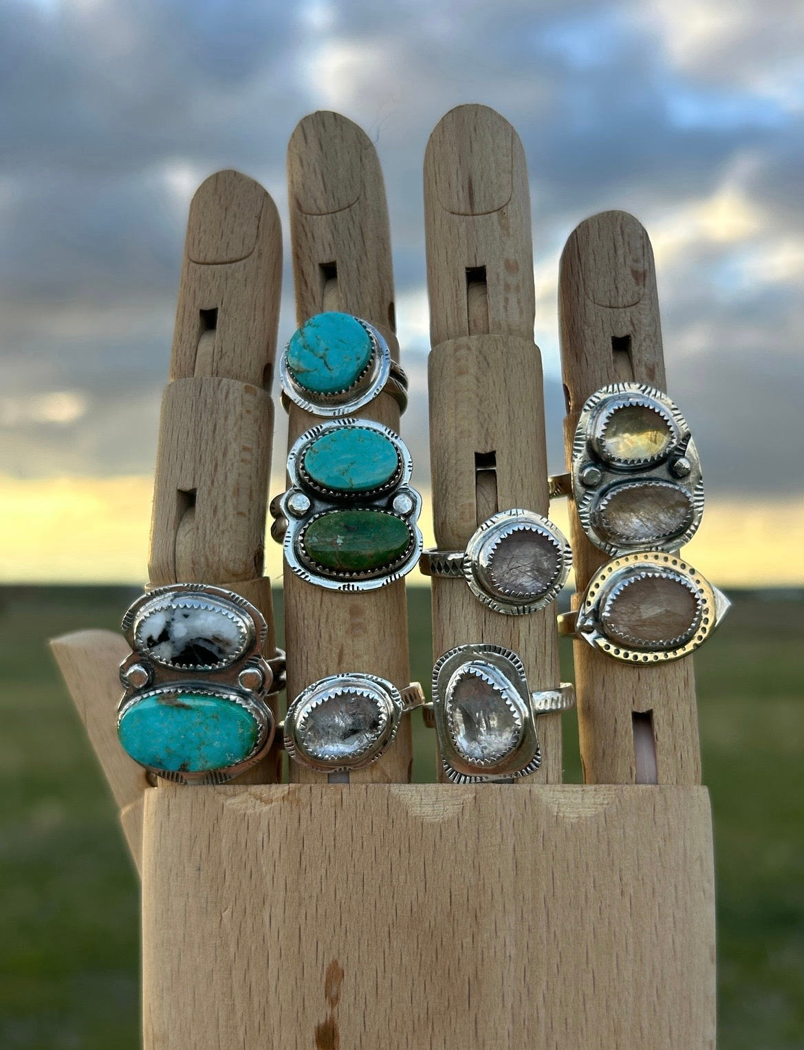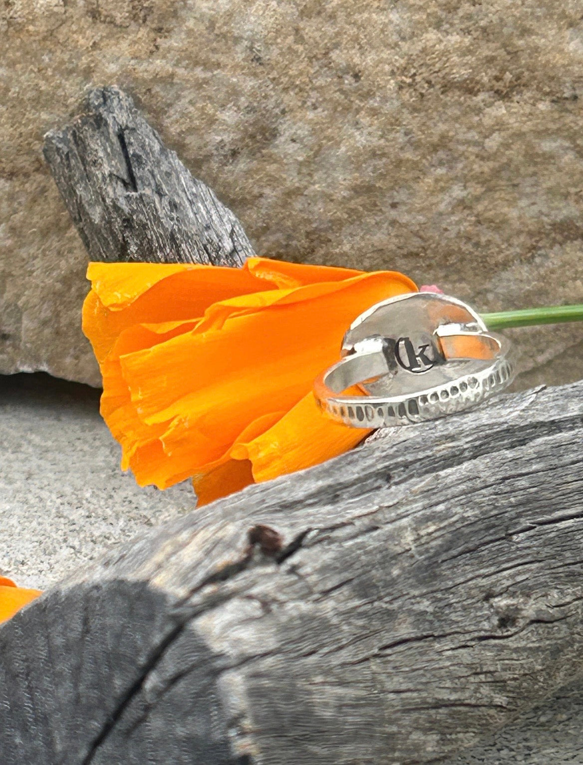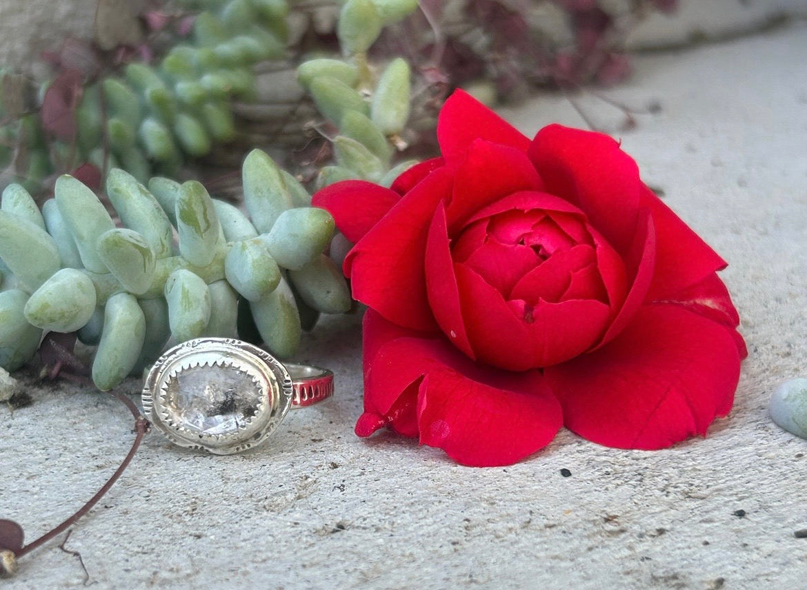 Incredible faceted Herkimer Diamond. Set in a hand stamped sterling silver frame and ringband. The stamping adds interest, texture, & catches the light. Organic , unique & one of a kind. This ring is fun to wear and feels amazing on.
